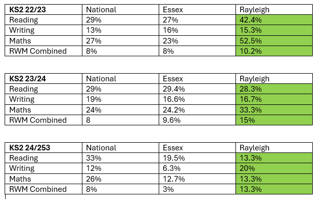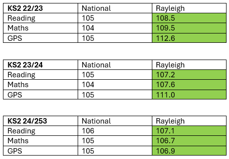 End of KS2 attainment at Rayleigh Primary School is consistently and significantly above that of the national average and local average.